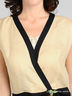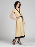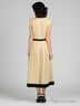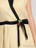 Легкое льняное платье без рукавов. Отрезной лиф с запахом. Вырез фиксирован вставкой кружевной ткани с вышивкой. Клешеная юбка в складку. В боковом шве застежка - потайная молния. Вырез, пояс и низ изделия окантованы льняной тканью черного цвета. Декоративный бант с нашивкой в стразах на поясе.