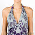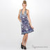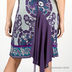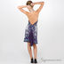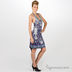 Оригинально платье с V-образным вырезом. С одной бретелей через шею, спинка оголена, по подолу вставка из отделочной ткани, сзади юбки оригинальная вставка из основного материала фиолетового цвета.