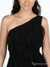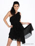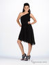 Легкое коктельное платье из двухслойного, полупрозрачного материала. Бретель на одно плечо. Втачной пояс сзади посажен на резинку. Потайная молния в боковом шве. Ассиметричный подол. Спереди декорировано оборками.