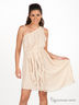 Легкое коктельное платье из двухслойного, полупрозрачного материала. Бретель на одно плечо. Втачной пояс сзади посажен на резинку. Потайная молния в боковом шве. Ассиметричный подол. Спереди декорировано оборками.