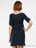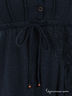 Детали: округлый вырез горловины, застежка на пуговицы спереди, короткие рукава с патами, талия на кулиске со шнурком, полочка с вертикальными защипами, юбка декорирована изящной вышивкой и бисером, подол с оборкой.
