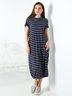 Стильное платье баллон в полоску, сзади капюшон. На спинке с одной стороны полоски идут вертикально, благодаря чему вытягивается фигура.