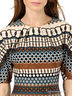 Детали: округлый вырез горловины, укороченный рукав, сборка по линии выреза, принты