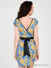 Детали: круглый вырез; глубокий V-образный вырез с запахом на спине; пристроченный пояс контрастного цвета; два кармана; оригинальный принт; полочка декорирована воланами
