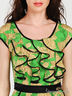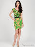 Детали: круглый вырез; глубокий V-образный вырез с запахом на спине; пристроченный пояс контрастного цвета; два кармана; оригинальный принт; полочка декорирована воланами