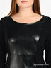 Элегантное платье из плотной трикотажной ткани приталенного силуэта с округлым вырезом горловины, застежкой на молнию на спине. Длинный прямой рукав. Полочка декорирована вставкой из искусственной кожи, шлица. Для настоящей леди.