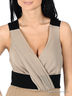 Детали: V-образный вырез, широкие лямки, скрытая застежка на молнию в левом боковом шве, контрастный декоративный пояс