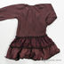 Округлый вырез горловины, спереди застежка на три пуговицы. Расклешенная юбка, вставка из ткани контрастной расцветки. К юбке пришиты три ряда рюш. Низ рукава присборен на резинку. На подоле нашивка с цветком.