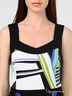 Детали: округлый вырез, без рукавов, втачной пояс украшен пуговицами, яркий оригинальный принт