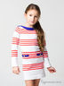 Вязаное платье из мягкой хлопковой пряжи. Модель прямого покроя с длинными рукавами и фигурным вырезом горловины. Дополнено изделие рисунком в контрастную полоску. Отличный вариант для детского гардероба.
