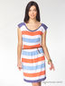 Трикотажное полотно средней плотности, полосы по кругу, без подкладки. Платье, отрезное по талии. Темно-синие полосы с эффектом меланж. Горловина спереди украшена косичкой из основной ткани и двумя металлическими пуговицами. Пояс в комплекте.