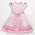 Расклешенное платье с присборенными рукавами застегивается на скрытую молнию на спинке. По боковым швам вшиты ленты, завязывающиейся в бант на спинке. Подол и подъюбник с оборками. Изделие украшено нашивками и вышивкой.