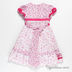 Расклешенное платье с рукавами-фонариками застегивается на скрытую молнию на спинке. По боковым швам вшиты ленты, завязывающиейся в бант на спинке. Подъюбник с оборкой. Рукава украшены рюшами. Завышенная линия талии обозначены пришиты лентами и брошкой с лентами и цветком. Подол декорирован рюшами.