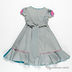 Расклешенное платье с присборенными рукавами застегивается на скрытую молнию на спинке. По боковым швам вшиты ленты, завязывающиеся в бант на спинке. Подол и подъюбник с оборками. Изделие украшено нашивками и вышивкой.