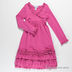 Платье прямого кроя с расклешенной юбкой и длинным рукавом. V-образный вырез. По боковым швам пришиты ленты, завязывающиеся в бант на спинке. Вырез горловины, манжеты и подол украшены рюшами и пайетками. Подол так же декорирован оборками.