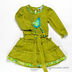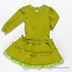 Платье прямого кроя с расклешенной юбкой и длинным рукавом. К манжетам пришиты присбаривающие резинки. Вырез горловины украшен рюшей. Полочка декорирована нашивкой, тесьмой и шнурками с бусинами. Подол украшен оборками.