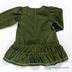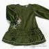 Велюровое расклешенное платье застегивается на скрытую молнию на спинке. Присборенные от плечевого шва рукава. К манжете пришиты присбаривающие резинки. Полочка декорирована нашивками и вышивкой.
