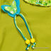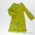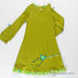 Слегка расклешенное платье с длинным рукавом застегивается на одну пуговицу на спинке. Многослойный рукав с оборками. Вырез горловины украшен рюшей. Полочка декорирована объемной бабочкой, шнуровками и бусинами. Такая же бабочка с шнурками, тесьмой и бусинами на подоле. Также подол украшен оборкой. Атласные бантики на рукавах.