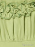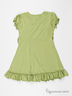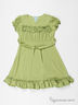 Детали: округлый вырез горловины, короткие рукава фонарики, отрезная расклешенная юбка с оборкой, завязки на спинке. Полочка декорирована рюшами.