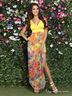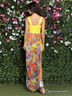 Оригинальное платье приталенного покроя с глубоким вырезом декольте. Изделие дополнено вставкой из легкого , принтованного материала контрастной расцветки. Сбоку разрез. Отличный вариант для создания летнего образа.