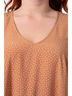 Обаятельное платье свободного силуэта из текстильного полотна бежевого цвета. V-образный вырез и проймы рукавов внутренними бейками. По низу изделия выполнена оборка из сетчатого полотна. Длина изделия по спинке от плечевого шва до низа изделия — см.