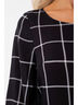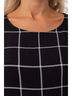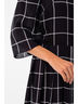 Эффектное платье прямого силуэта из текстильного полотна черно-белого цвета. Круглый вырез изделия обработан внутренней бейкой. Платье с втачными рукавами и отрезной юбкой по линии талии. Юбка дополнена декоративными складками. Длина изделия по спинке от плечевого шва до низа изделия — 104 см.