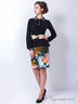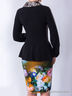 Линию талии и бедер подчеркивает баска (широкая оборка, пришиваемая по линии пояса к платью или блузке). Отложной круглый воротник. По планке переда - застежка на пуговицы. По низ