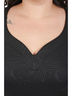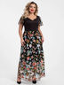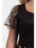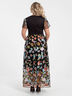 Очаровательное платье полуприлегающего силуэта из трикотажного полотна черного цвета. Фигурный вырез изделия обработан внутренней обтачкой. Втачные рукава-крылышки выполнены из тонкой вышитой сетки. Изделие отрезное по линии талии. Низ платья двойной, верхний слой выполнен из роскошного кружева с цветочной вышивкой. Спинка изделия дополнена застежкой на потайную молнию.