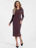 Обаятельное платье прилегающего силуэта из трикотажного полотна коричневого цвета. Круглый вырез изделия обработан внутренней бейкой. Отрезная кокетка и втачные рукава выполнены из кружевного полотна с бархатным напылением. Длина изделия по спинке от плечевого шва до низа изделия - 110 см. Рост фотомодели — 170 см.