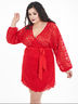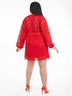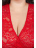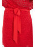 Эффектное платье полуприлегающего силуэта из кружевного полотна красного цвета. По переду изделия выполнен запах. V-образный вырез изделия обработан внутренней бейкой Цельнокроеные рукава обработаны манжетами. Платье дополнено поясом. Длина изделия по спинке от плечевого шва до низа изделия - 98 см. Рост фотомодели — 170 см.