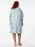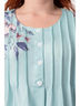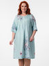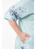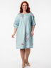 Привлекательное платье свободного силуэта из текстильного полотна мятного цвета. Круглый вырез изделия обработан внутренней обтачкой. Кокетка переда дополнена планкой с застежкой на пуговицы и декоративными отстрочками. Платье со спущенной проймой и втачными рукавами. По бокам изделия выполнены карманы. Длина изделия по спинке от плечевого шва до низа изделия — 110 см.