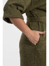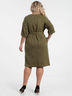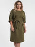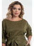 Женственное платье полуприлегающего силуэта из трикотажного полотна оливкового цвета. Круглый вырез изделия обработан внутренней обтачкой. Цельнокроеные рукава обработаны манжетами. В комплект входит пояс - «кушак». Длина изделия по спинке от плечевого шва до низа изделия — 100 см.