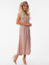 Стильное платье полуприлегающего силуэта из текстильного полотна персикового цвета. Платье с отложным воротником. По переду изделия выполнена планка с застежкой на пуговицы. Платье с отрезной юбкой по линии талии, которая эффектно подчеркнута сборкой. Длина изделия по спинке от плечевого шва до низа изделия — 120 см.