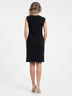 Яркое платье полуприлегающего силуэта из трикотажного полотна серо-синего цвета. Круглый вырез изделия и проймы рукавов обработаны окантовкой. Перед изделия выполнен из полотна с пайетками. Длина изделия по спинке от плечевого шва до низа изделия — 98 см.