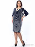 Стильное платье полуприлегающего силуэта из трикотажного полотна с купонным рисунком. Круглый вырез и спущенные проймы рукавов обработаны контрастным кантом. Аксессуары в комплект не входят.