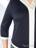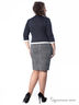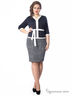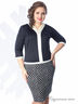 Изысканное платье прилегающего силуэта из плотного трикотажного полотна. Имитация костюма — жакета и юбки. Стильное сочетание глубокого синего и насыщенного белого цвета. Фигурный вырез украшен декоративным элементом.