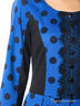 Романтичное платье силуэта «Песочные часы» из плотного трикотажного полотна сине-черного цвета. Круглый вырез изделия обработан внутренней обтачкой. Платье с рукавами «реглан», отрезное по линии талии. Перед изделия украшен кружевом и декоративными камнями.