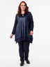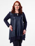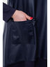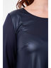 Стильное платье полуприлегающего силуэта из трикотажного полотна синего цвета. Круглый вырез изделия обработан внутренней обтачкой. Платье с втачными рукавами. Перед изделия выполнен из текстильного полотна имитирующего «кожу». Платье дополнено накладными карманами. Длина изделия по спинке от плечевого шва до низа изделия - 87 см. Рост фотомодели — 170 см.