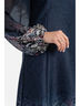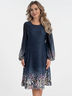 Очаровательное платье прилегающего силуэта из трикотажного полотна синего цвета с купонным рисунком. Круглый вырез изделия обработан внутренней обтачкой. Втачные рукава выполнены из шифона и обработаны окантовкой. Длина изделия от плечевого шва по спинке до низа изделия — 101 см.