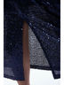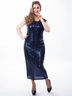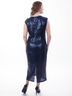 Восхитительное платье прилегающего силуэта из трикотажного полотна синего цвета. Платье двойное: верхняя часть выполнена из трикотажного полотна, расшитого пайетками. Внизу однотонный подклад из трикотажного полотна черного цвета. Низ изделия по спинке дополнен разрезом.