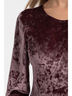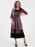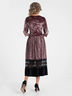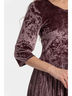 Роскошное платье полуприлегающего силуэта из трикотажного бархатного полотна сиренево-розового цвета. Круглый вырез горловины обработан внутренней обтачкой. Платье с втачными рукавами. Изделие отрезное по линии талии. Юбка платья выполнена из гофрированного бархатного полотна и дополнена по низу широкой вставкой из кружева.