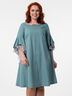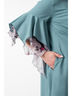 Роскошное платье А-силуэта из текстильного полотна зеленого цвета. Круглый вырез изделия обработан внешней обтачкой. Втачные рукава дополнены широкими оборками из основного полотна и шифона. Длина изделия по спинке от плечевого шва до низа изделия — см.