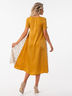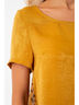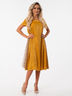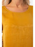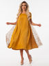 Очаровательное платье А-силуэта из текстильного полотна желтого цвета. Круглый вырез изделия обработан внутренней обтачкой. По бокам изделия широкие вставки из декоративной сетки. Длина изделия по спинке от плечевого шва до низа изделия — 109 см. Рост фотомодели — 170 см.
