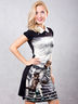 Яркое платье с короткими рукавами и отложным воротником. Слегка расклешенный силуэт. Застежка на пуговицы. Выполнено из приятного на ощупь материала. Оригинальный принт.