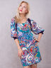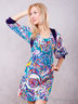 Молодежное платье в яркой цветовой гамме. Перед изделия украшен контрастными вставками и декоративной деталью в форме "качели". Свободный рукав три четверти дополнен контрастной манжетой.