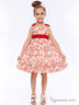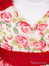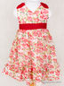 Нежное летнее платье с цветочным принтом. V-образный вырез горловины с эффектом запаха. На плечах и на талии вставки из контрастной ткани в виде бантиков и пояса на резинке. По подолу идет широкий волан, украшенный оборками. Пышная юбка на хлопковом подкладе.