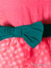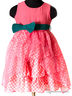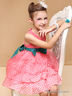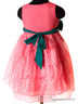 Отрезной лиф выполнен из в мелкий горошек. Завышенная талия подчеркивается поясом из контрастной изумрудной ткани с бантом. Низ платья выполнен из шикарной многослойной пышной юбки на подкладе оформлен многорядными воланами. Поверх воланов подол из прозрачной ткани, как у настоящей принцессы. Застежка на молнию на спинке.