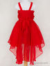 Яркое, шикарное платье для торжеств ассиметричного кроя. Отрезной лиф на бретелях отлично дополняется большим бантом из смешанной ткани в тон. Низ платья выполнены в виде пышной многослойной юбки на подкладе с ассиметричным кроем подола. Пояс-лента сзади, застежка на молнию.