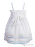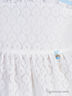Нежнейшее кружевное платье белого цвета, декорированное голубыми полосами и малозаметными воланами по краям. Тонкие бретели и завязанный бантом пояс на спине подчеркнут хрупкость вашей девочки. Маленькое украшение на поясе – небольшой, но значимый акцент белоснежного наряда.