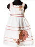 Расклешенное к низу платье без рукавов. Завышенная талия, квадратный вырез горловины украшен декоративным бантом и прошитыми складками, застежка на молнию сбоку. Сзади на спинке бант из аналогичной ткани. По всему платью аппликации и вставки в стиле петчворк и бант из золотистых лент. Юбка на хлопковом подкладе.